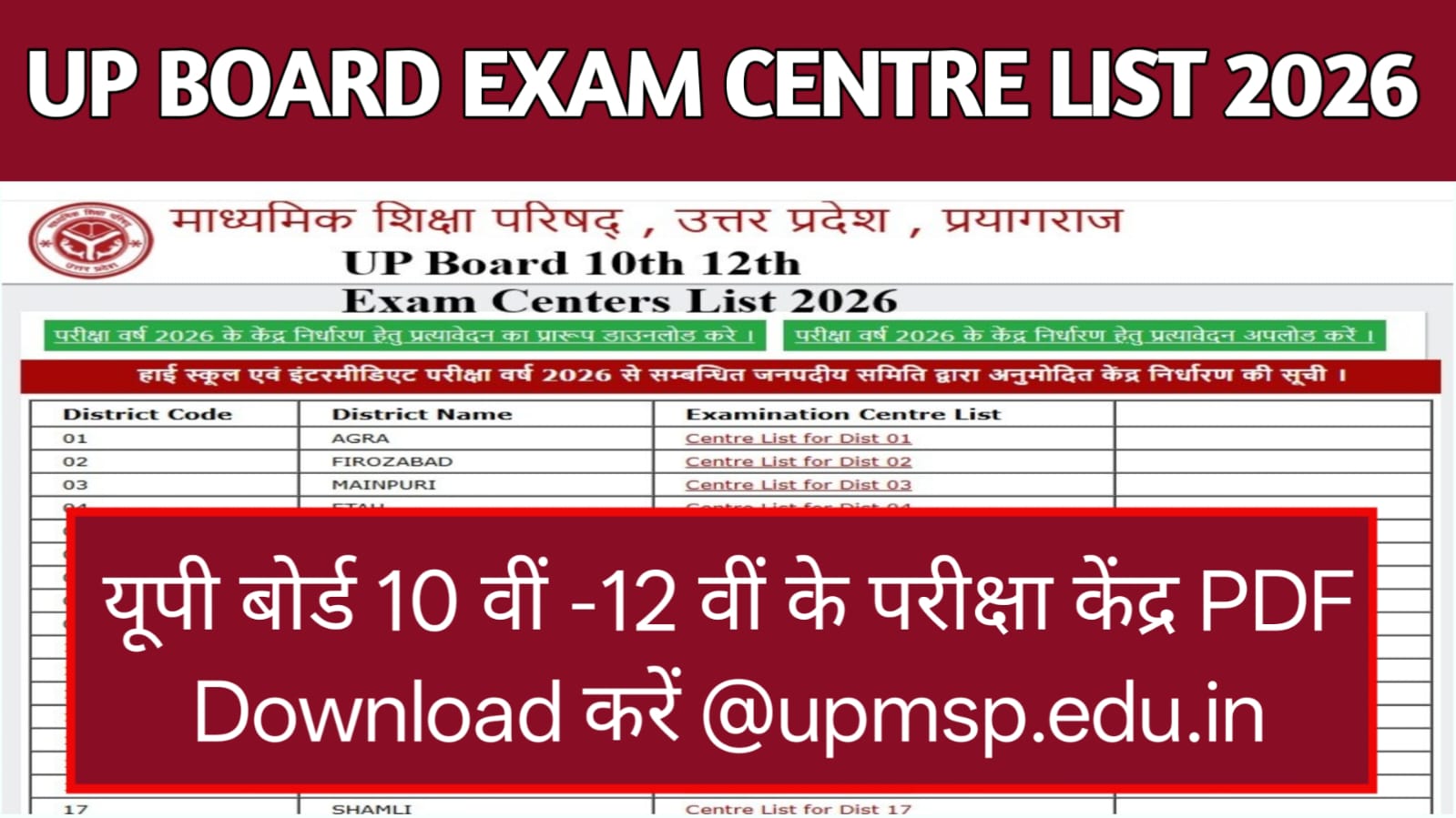 UP बोर्ड परीक्षा केंद्र सूची 2026 जारी: UP बोर्ड कक्षा 10वीं और 12वीं की परीक्षा केंद्र सूची PDF फॉर्मेट में @upmsp.edu.in से डाउनलोड करें।